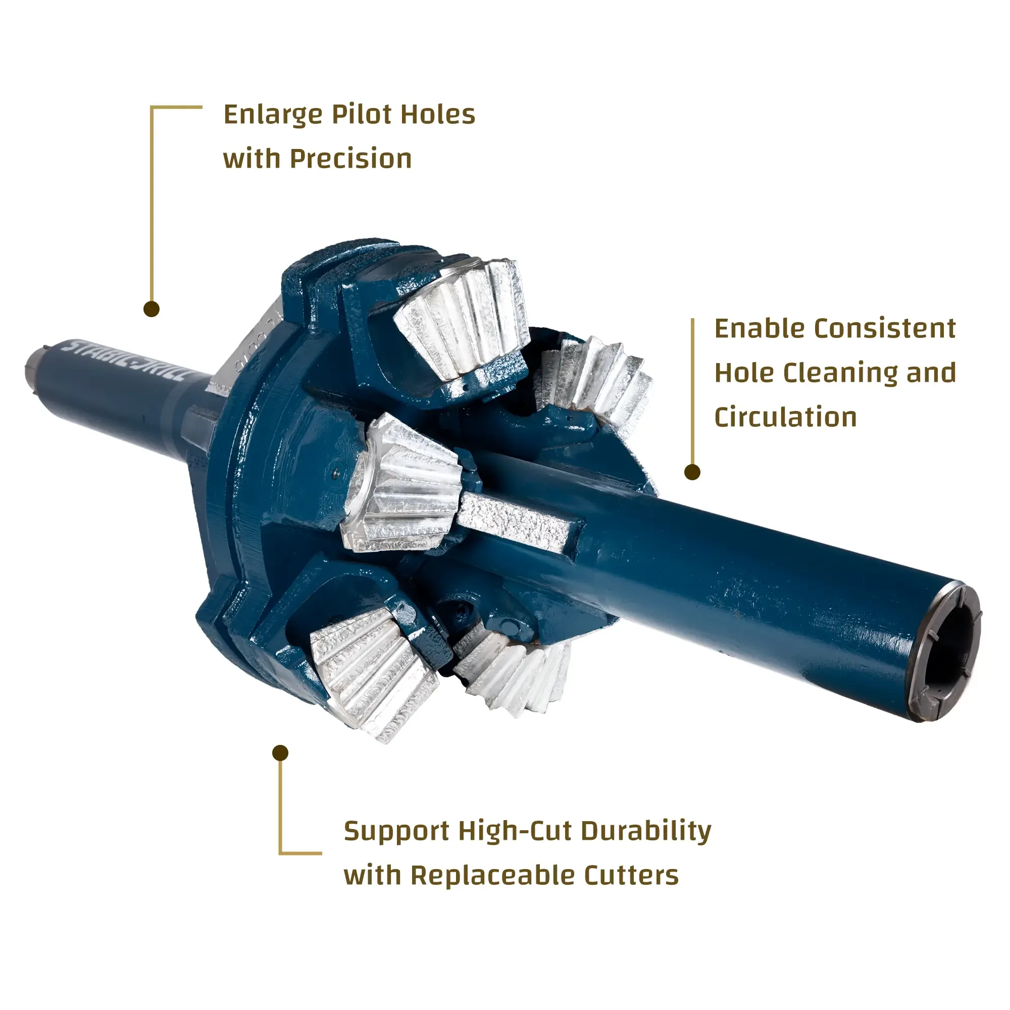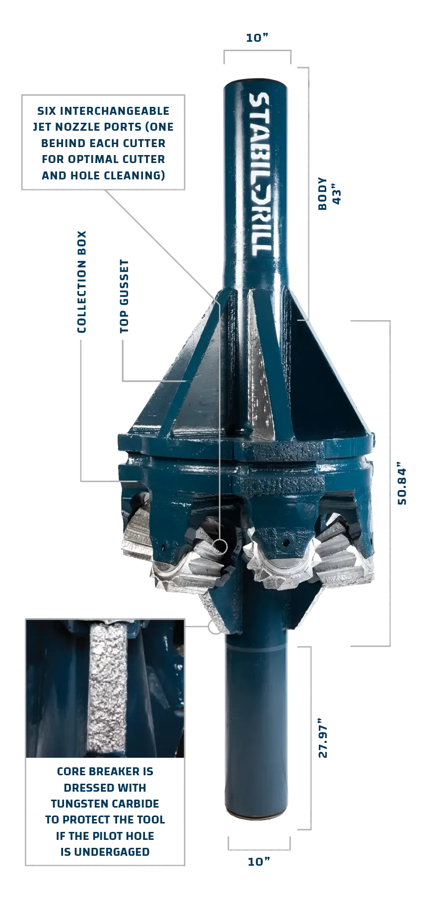 This design optimizes hole cleaning through use of a box collector that creates even fluid flow directly onto the unit's cutters. Accommodates up to 60”, and features either three or four cutters. Custom sizes and designs available; ask your Stabil Drill representative for details.