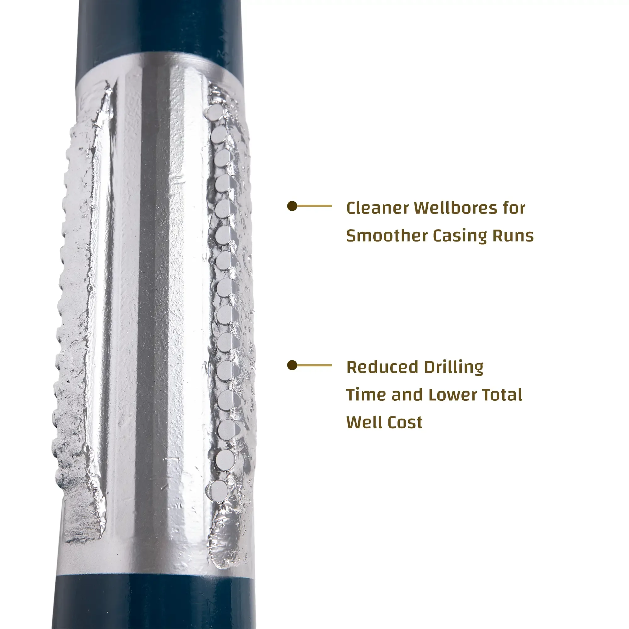 The latest Stabil Drill innovation, our Smoothbore™ Eccentric Reamer helps reach target depth more quickly. Its spiral design delivers a full cut in a single rotation—accelerating rate of penetration in a way that has cut up to two days and $100,000 from drilling operations. With a rated tool speed of 240 feet per hour or faster, and carbide buttons that protect the cutting structure, the Smoothbore gets you there fast.