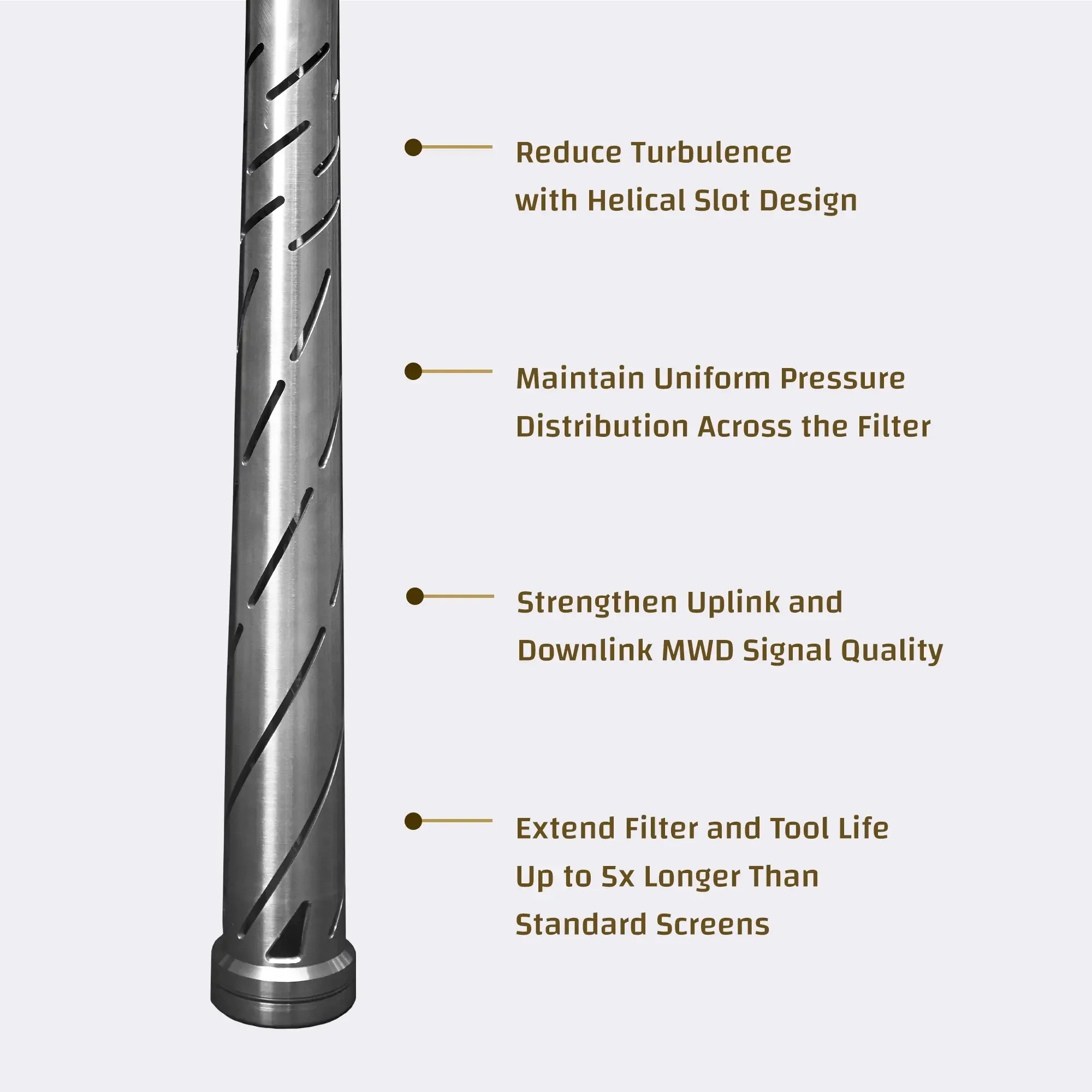 Engineered to improve tool longevity and signal strength, this groundbreaking filter screen utilizes helical slots to uniformly distribute pressure, which reduces tool erosion and lowers turbulence. Smarter Filtering. Longer-Lasting Tools