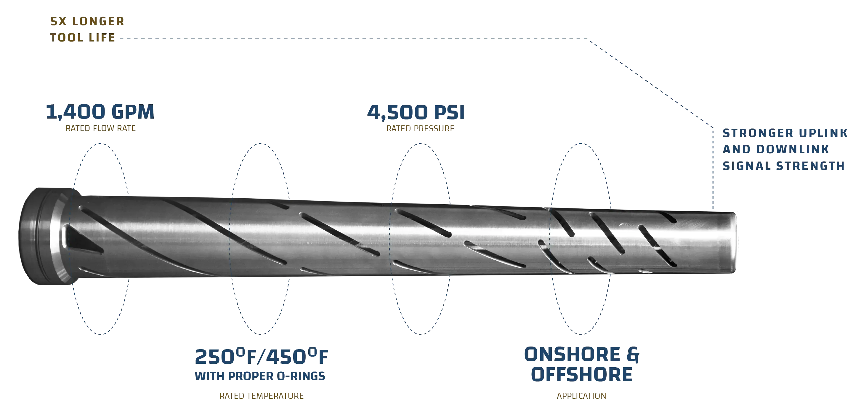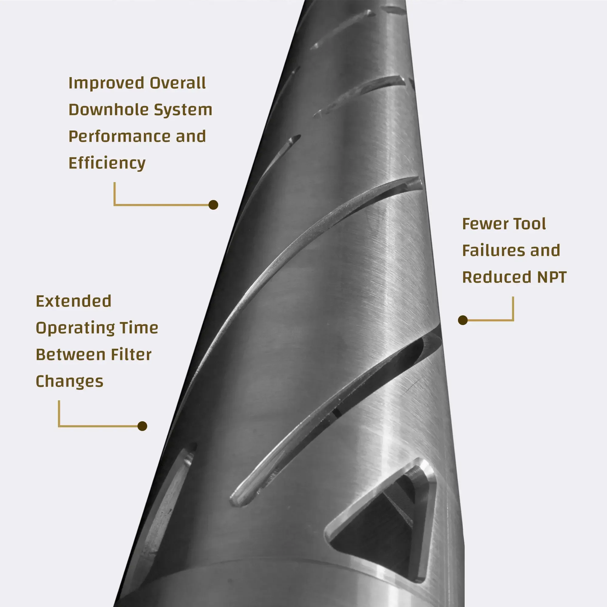 Helical slots on the filter screen create a laminar flow, producing a uniform pressure distribution that dramatically lowers turbulence. This groundbreaking new design leads to stronger uplink and downlink signal strength and improved steerability for your BHA.